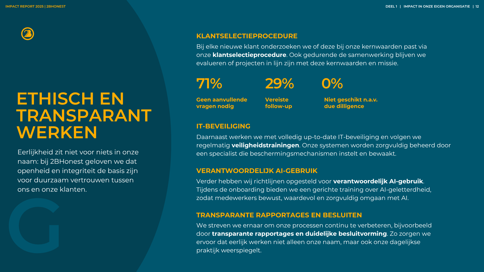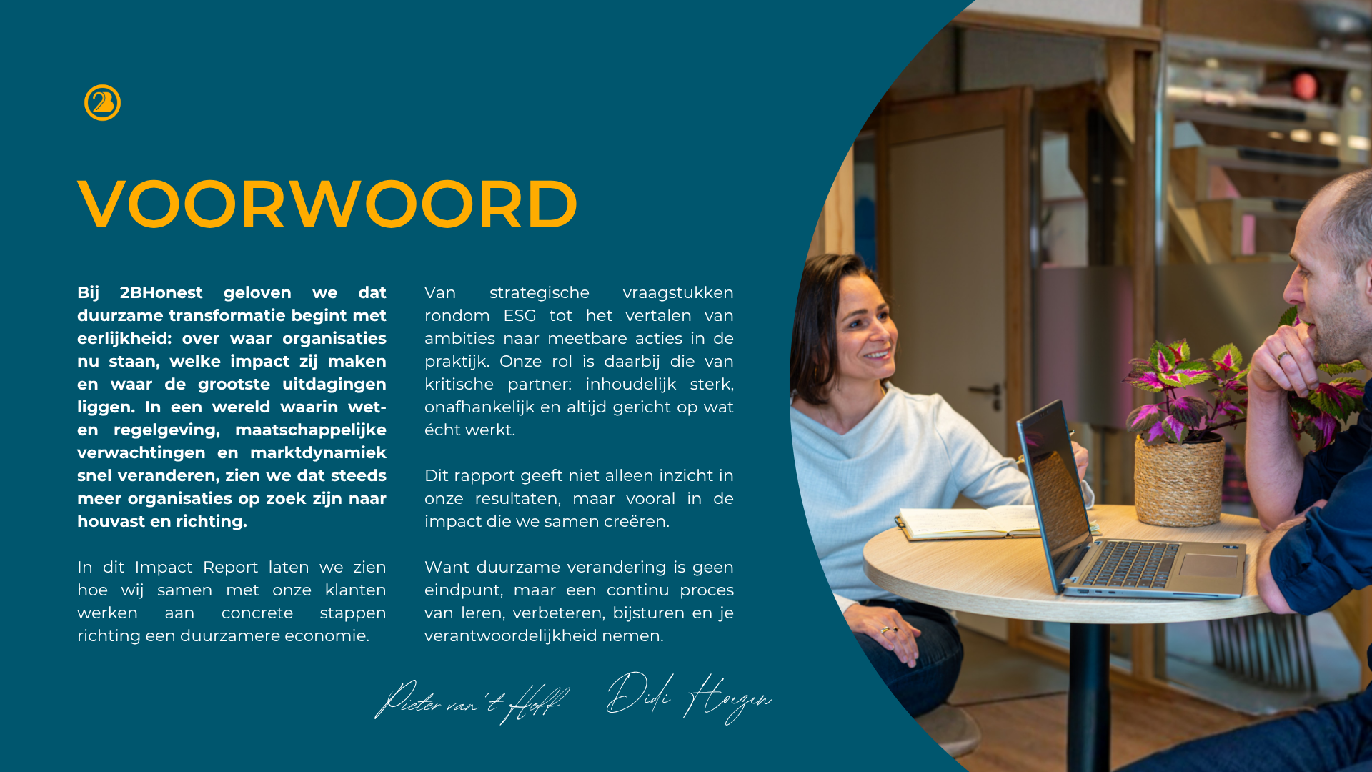 Onze naam zegt het al, wij houden van eerlijk en transparant. Voor ons is het dan ook simpel: we bouwen het liefst een band op met onze klant en schakelen op elk level. Aan tafel met het managementteam? We begrijpen de uitdagingen en dragen bij om die te overwinnen. Samenwerken met de operationele uitvoering? We helpen de processen te optimaliseren en de resultaten te verbeteren. We hebben oog voor de inhoud, maar ook voor de context én de stakeholder relaties. En met onze engagementprogramma’s en transitiemodellen zorgen we voor het zo belangrijke informeren, inspireren en activeren. Zo maken we complexe vraagstukken tastbaar. En zo dragen we bij aan een identiteit en gezicht, passend bij je bedrijf of de organisatie. Over gezichten gesproken, dit zijn de ónze.