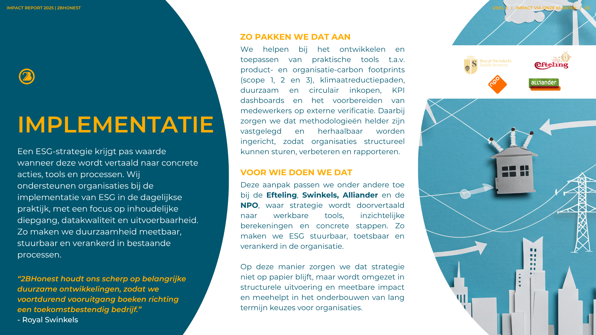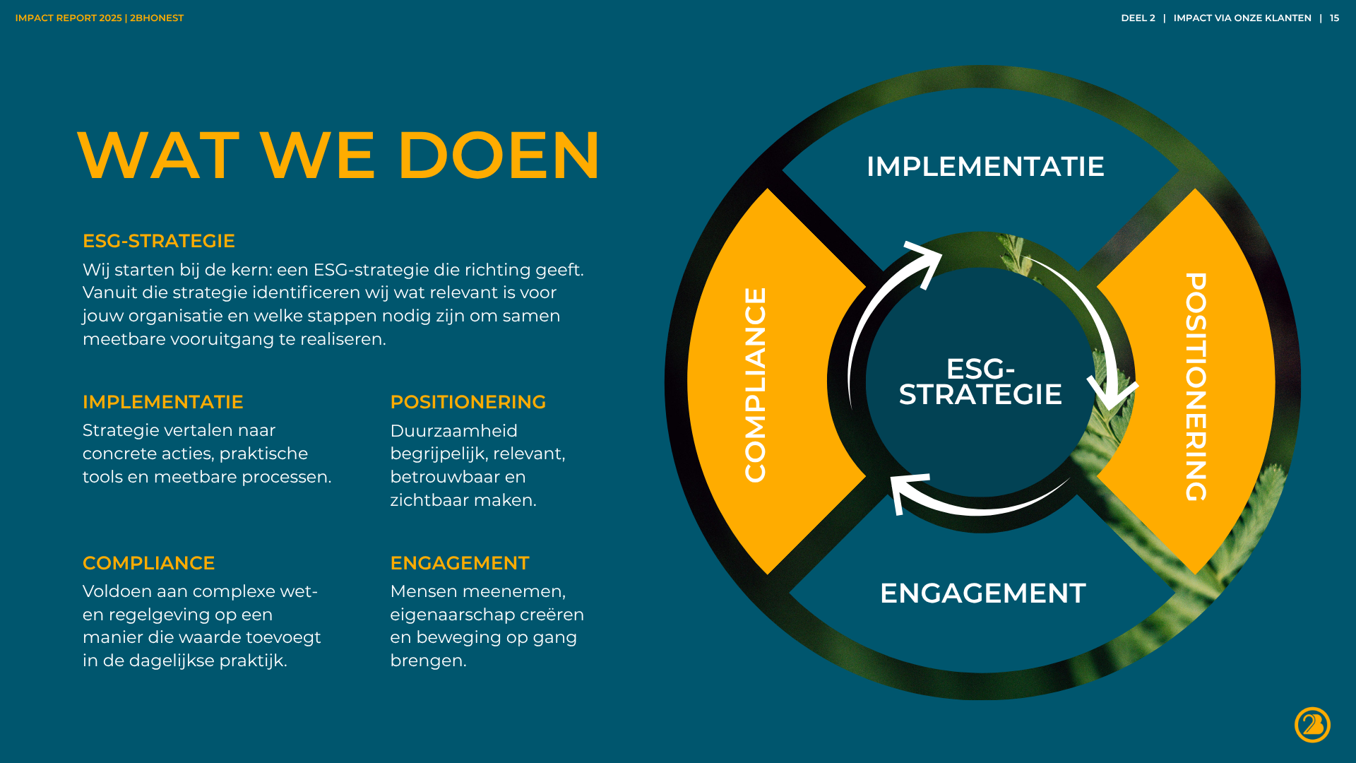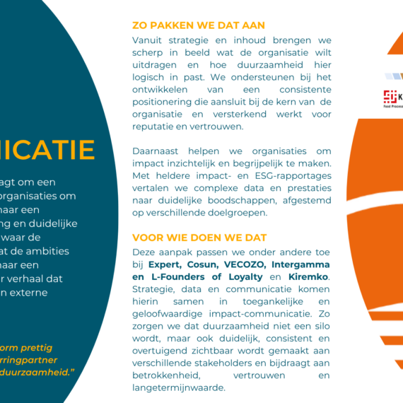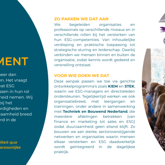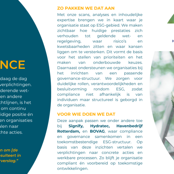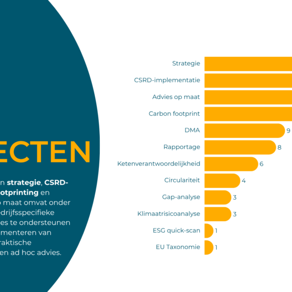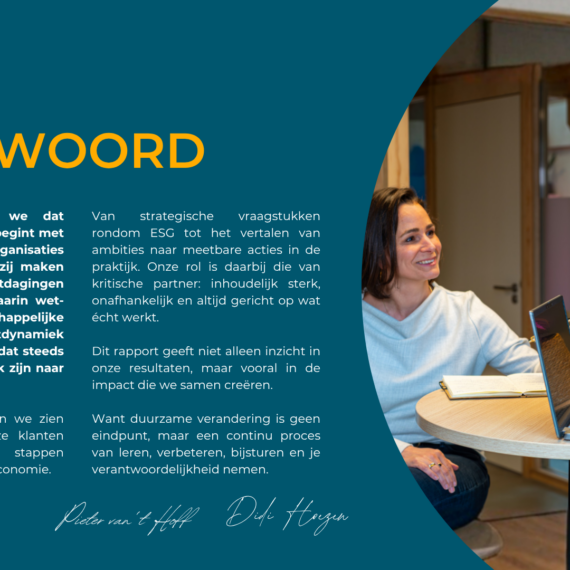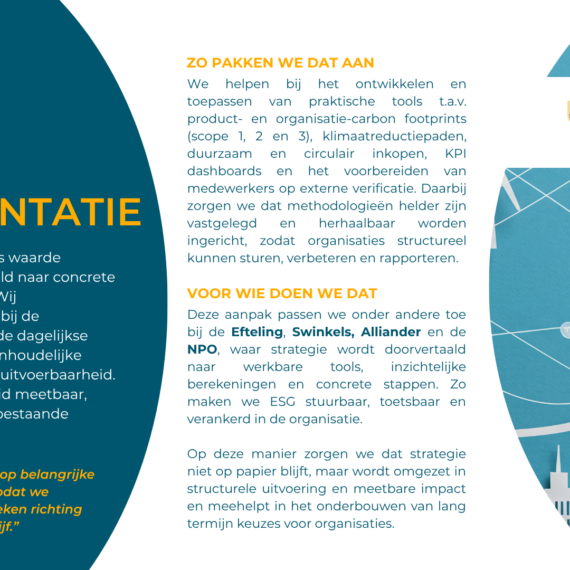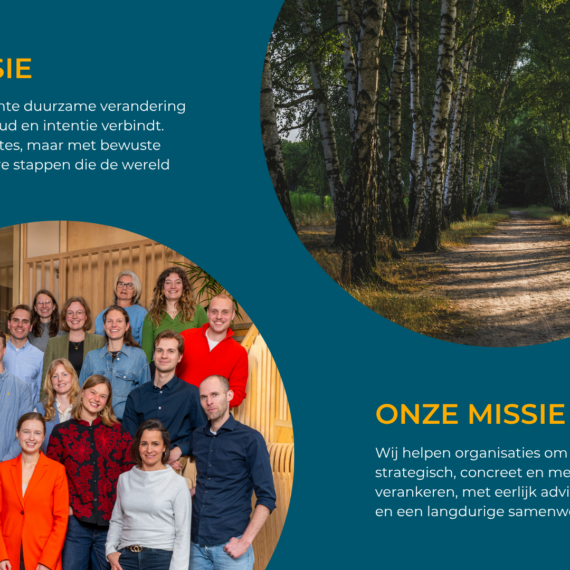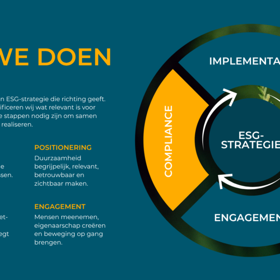 Verduurzaming is niet zomaar ‘een project’ erbij. Het is een verandering in de kern van een bedrijf. Natuurlijk kunnen wij heel goed op strategisch niveau ‘leveren’ en helpen we bij het voldoen aan wet- en regelgeving. Maar daar begint het pas. We zien het als een startschot. De hele bedrijfsvoering gaat onder de loep. We werken samen aan het implementeren van ambities. We zorgen dat ze praktisch haalbaar zijn (en leuk!). We wakkeren aan en creëren begrip. En we werken toe naar concrete resultaten.